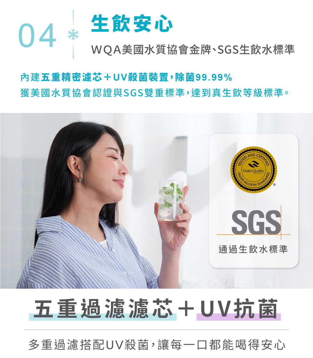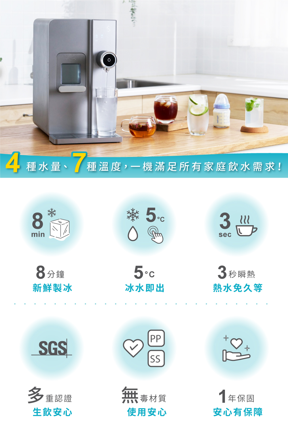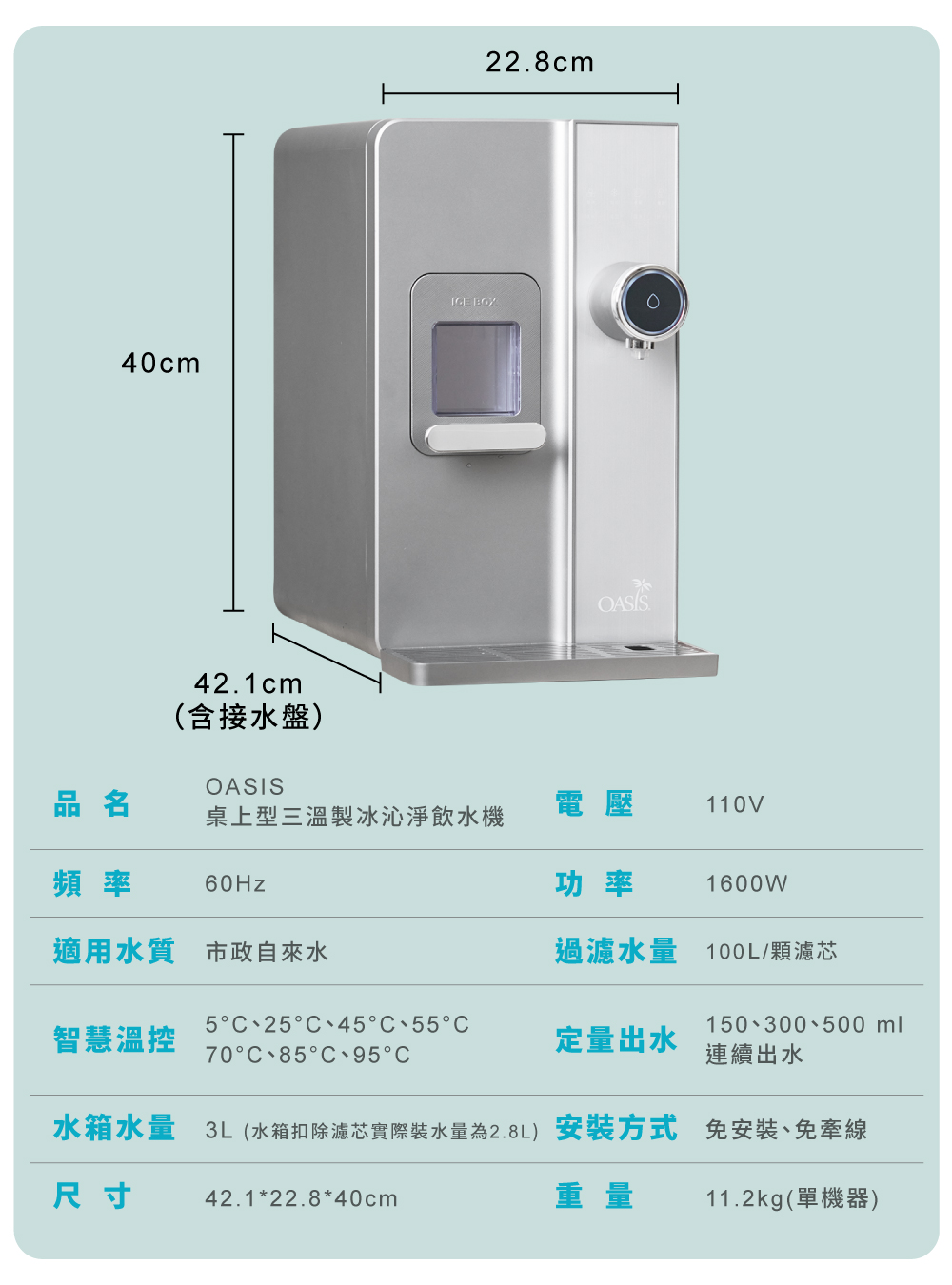 1.快速製冰:每8分鐘快速製作子彈冰(每次8顆) 2.5度C冰水:冰箱同類型壓縮機,隨時提供5度真冰水 3.3秒瞬熱:專業不鏽鋼厚膜加熱,即熱即飲 4.OASIS五重過濾濾心:通過SGS生飲水標準與WQA美國水質協會金牌 5.UV抗菌:內建UV殺菌裝置,搭配濾心,每一口水都喝得安心 6.7段溫控設計:5-95度C(5/常溫/45/55/70/85/95度C) 7.4段水量:150cc/300cc/500cc/連續出水 8.免安裝設計:內建2.8L水箱,插電即用