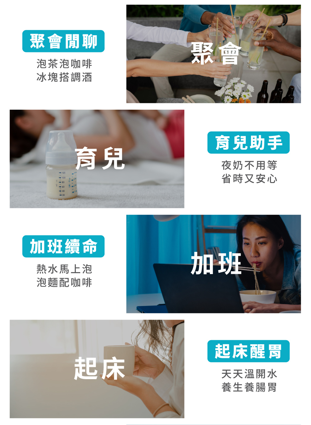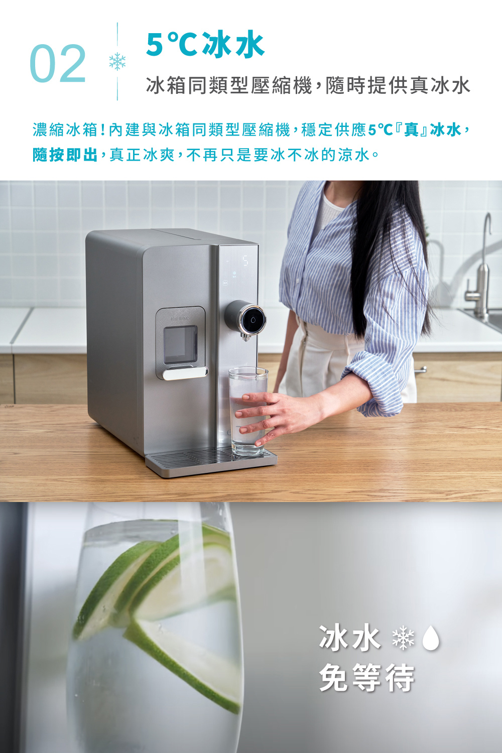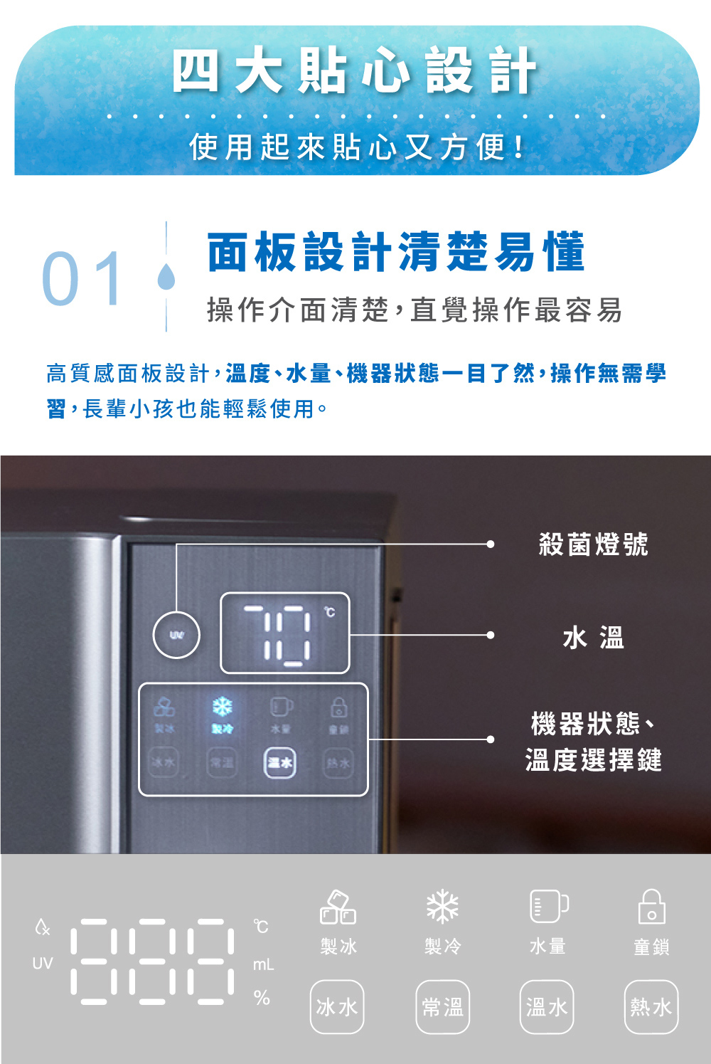 1.快速製冰:每8分鐘快速製作子彈冰(每次8顆) 2.5度C冰水:冰箱同類型壓縮機,隨時提供5度真冰水 3.3秒瞬熱:專業不鏽鋼厚膜加熱,即熱即飲 4.OASIS五重過濾濾心:通過SGS生飲水標準與WQA美國水質協會金牌 5.UV抗菌:內建UV殺菌裝置,搭配濾心,每一口水都喝得安心 6.7段溫控設計:5-95度C(5/常溫/45/55/70/85/95度C) 7.4段水量:150cc/300cc/500cc/連續出水 8.免安裝設計:內建2.8L水箱,插電即用
