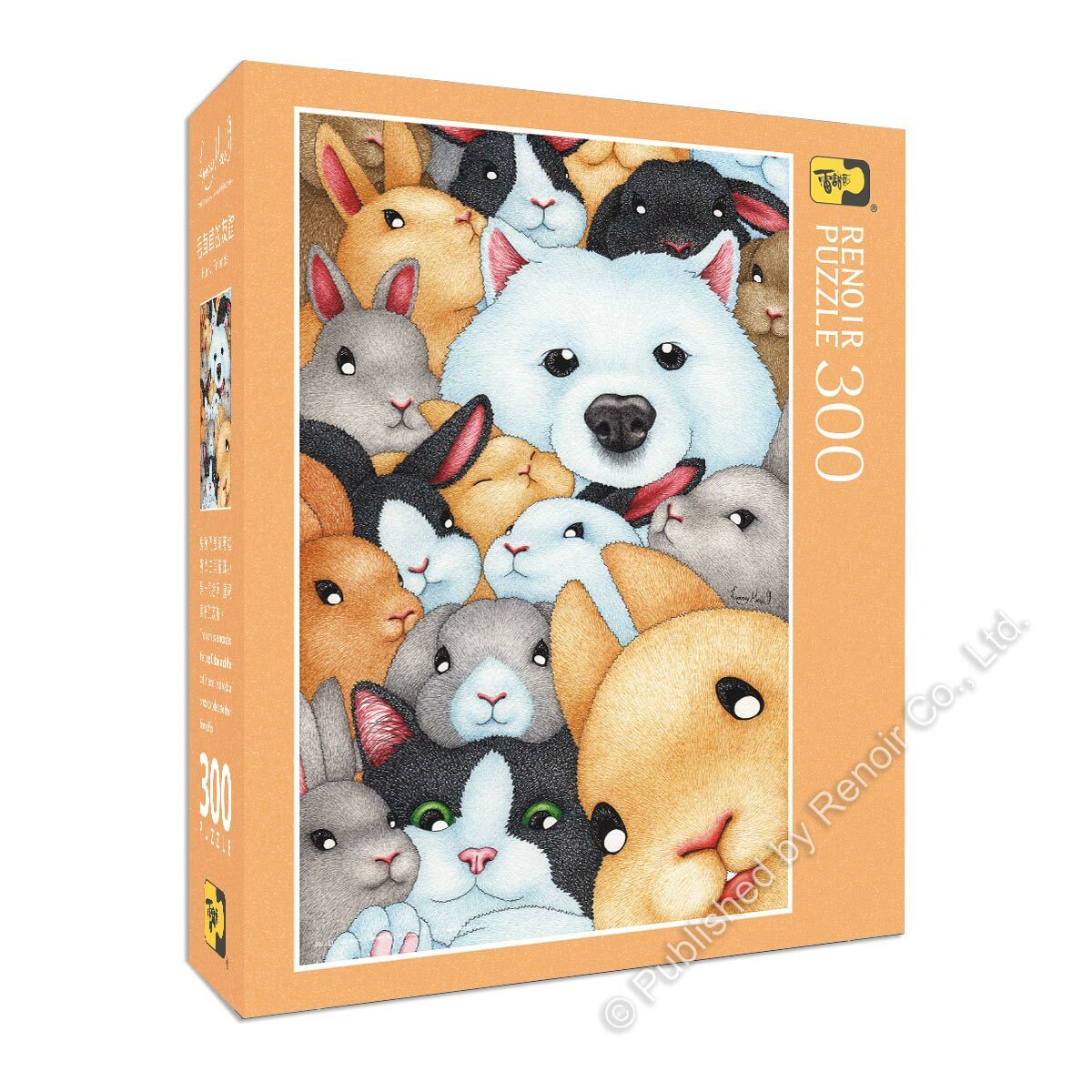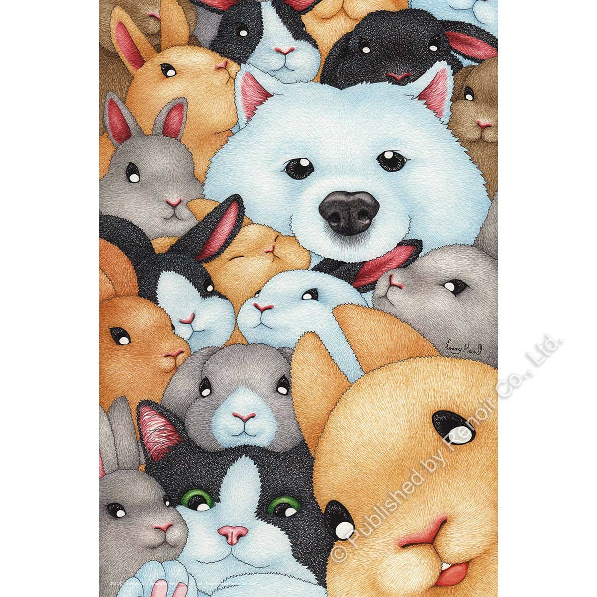 兔兔們簇擁著貓咪小黑與狗狗大白一同合照,慶祝美好的友誼。