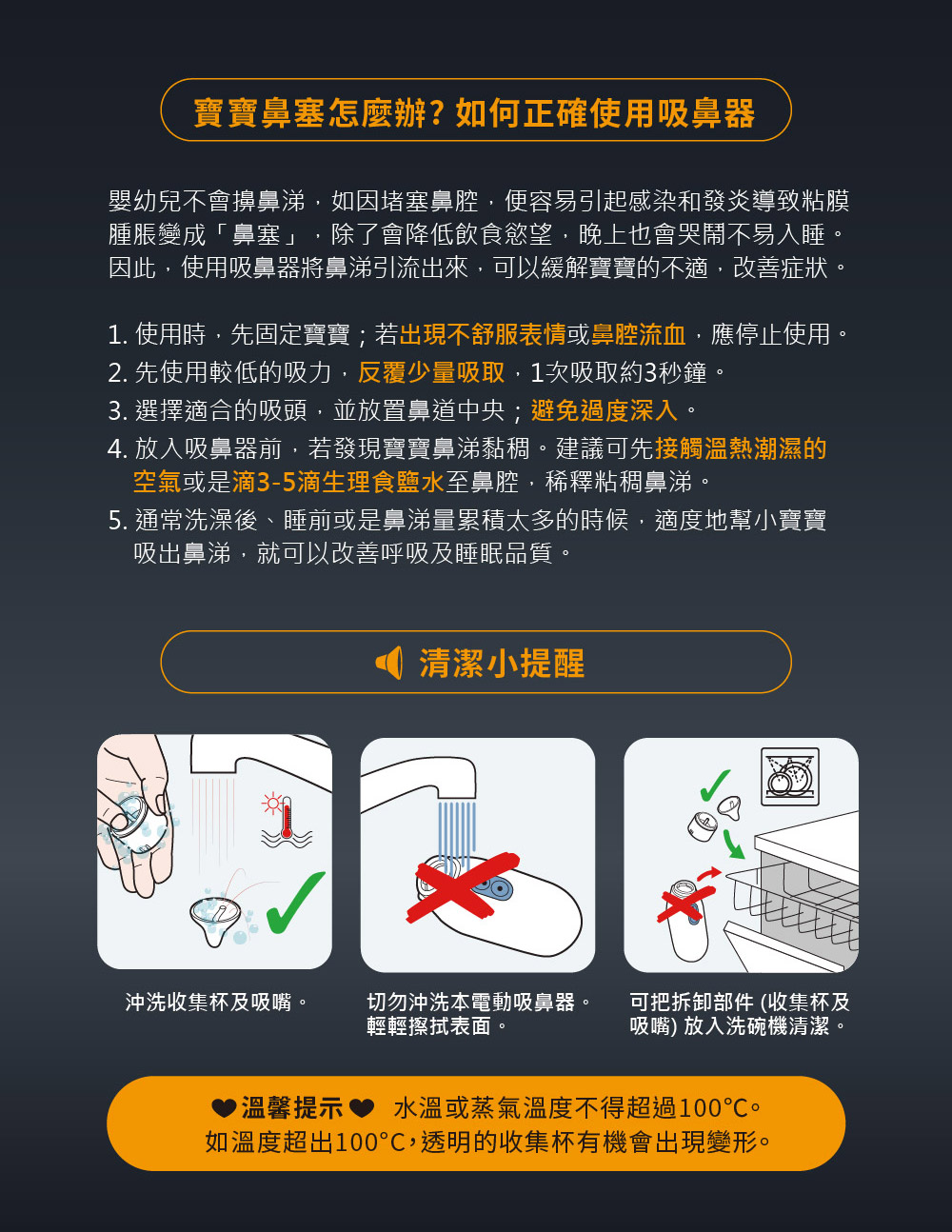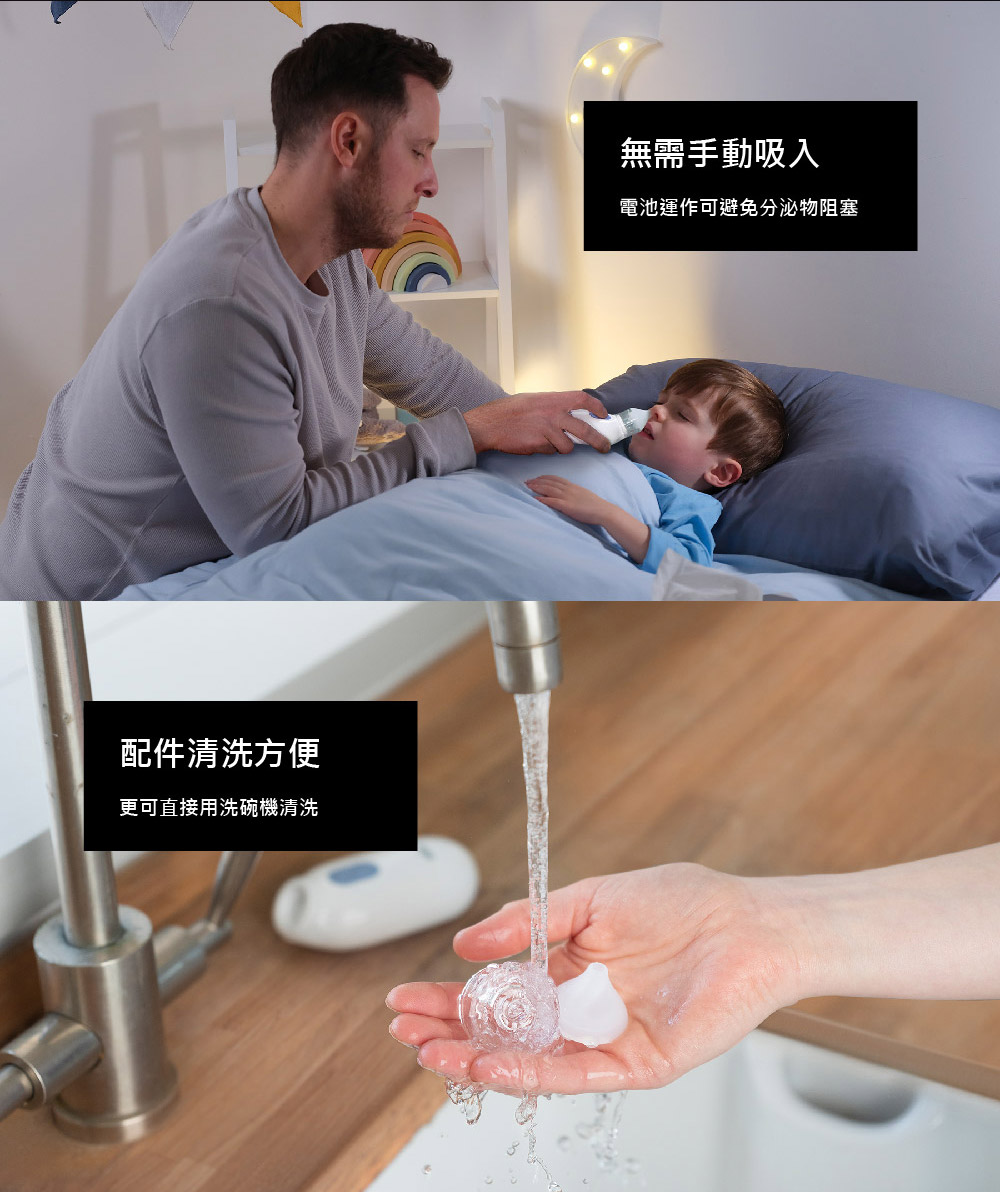 溫馨提醒:請不要直接將吸鼻器吸水清潔,可拆卸部分(吸嘴及收集杯)洗碗機清潔水溫不得超過100°C或蒸汽溫度。