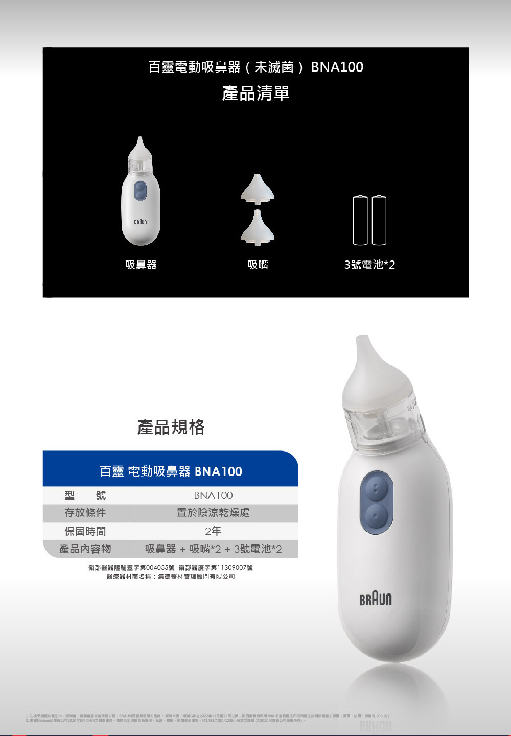 1、 商品組合/規格:百靈 Braun 電動吸鼻器 BNA100 (未滅菌)