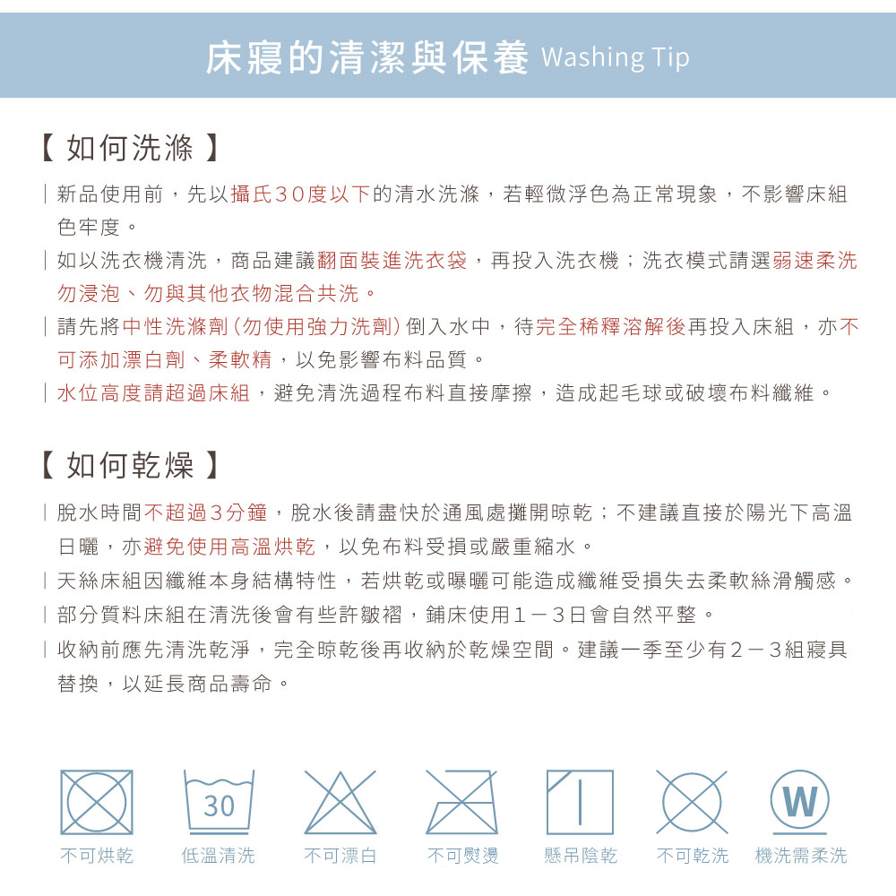 ▪ 可水洗或送洗,放入洗衣袋為佳,與深色商品分開洗即可;不可漂白、乾洗,且不建議烘乾,並定期日曬達到消毒除溼效果。