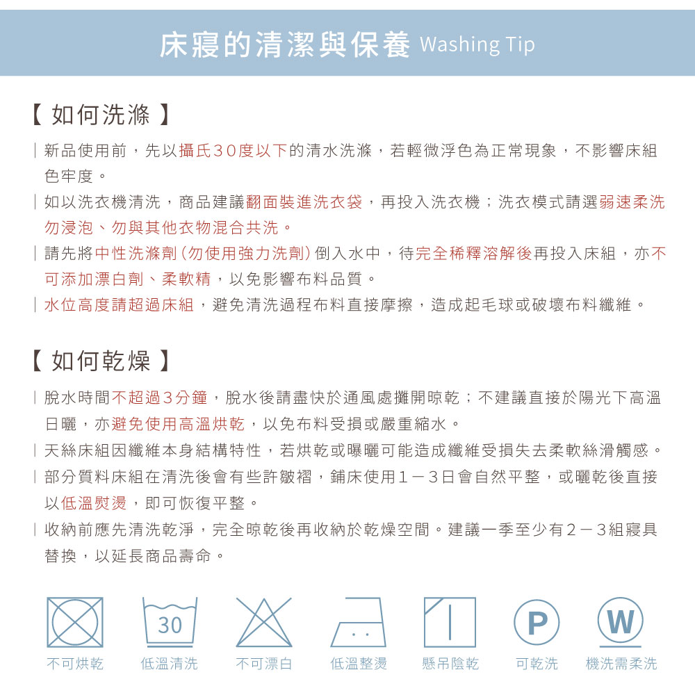 ▪ 可水洗或送洗,放入洗衣袋為佳,與深色商品分開洗即可;不可漂白、乾洗,且不建議烘乾,並定期日曬達到消毒除溼效果。