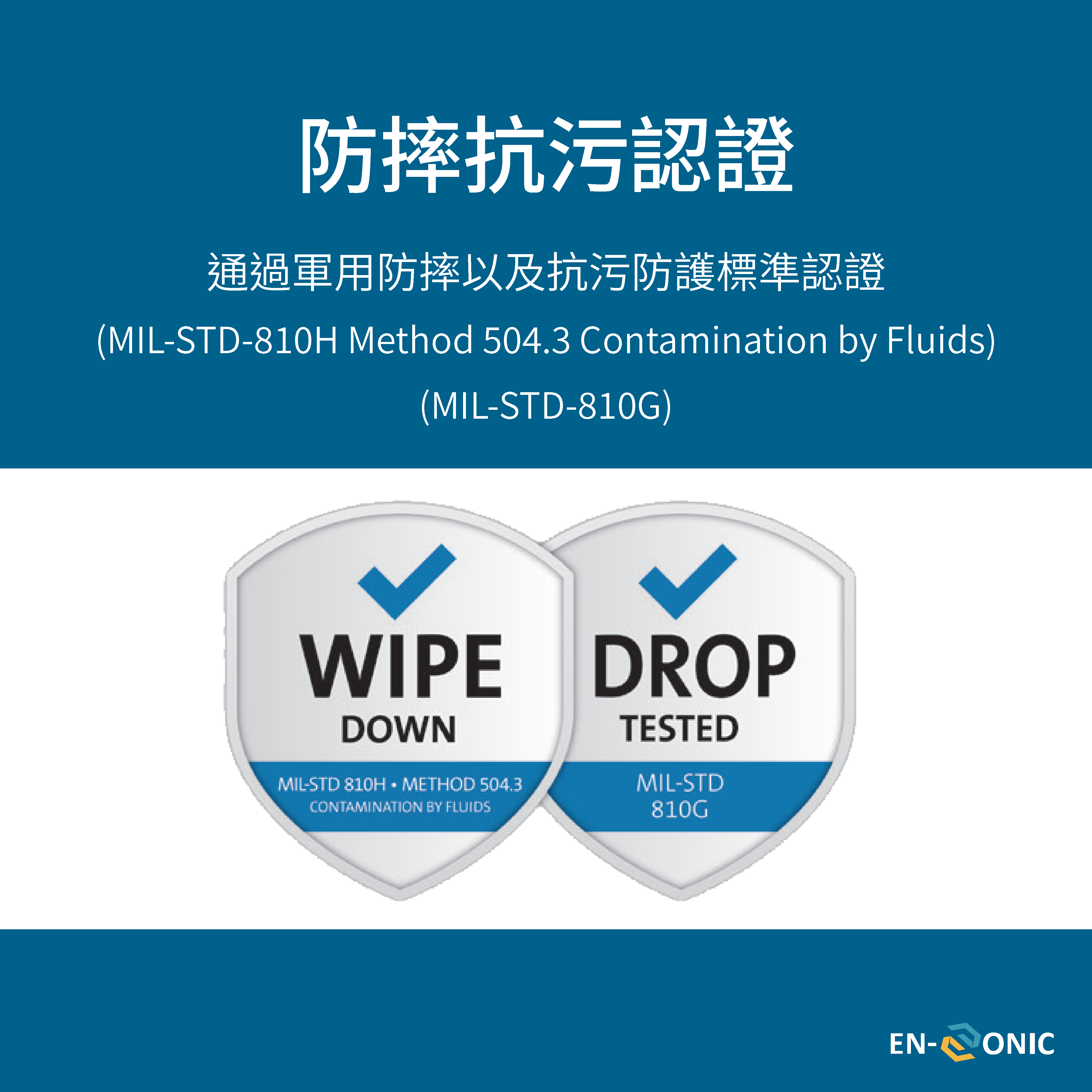 為任何場合隨時準備,防護殼通過液體抗污(MIL-STD-810H Method 504.3 Contamination by Fluids)以及軍規防摔 (MIL-STD-810G) 標準認證。