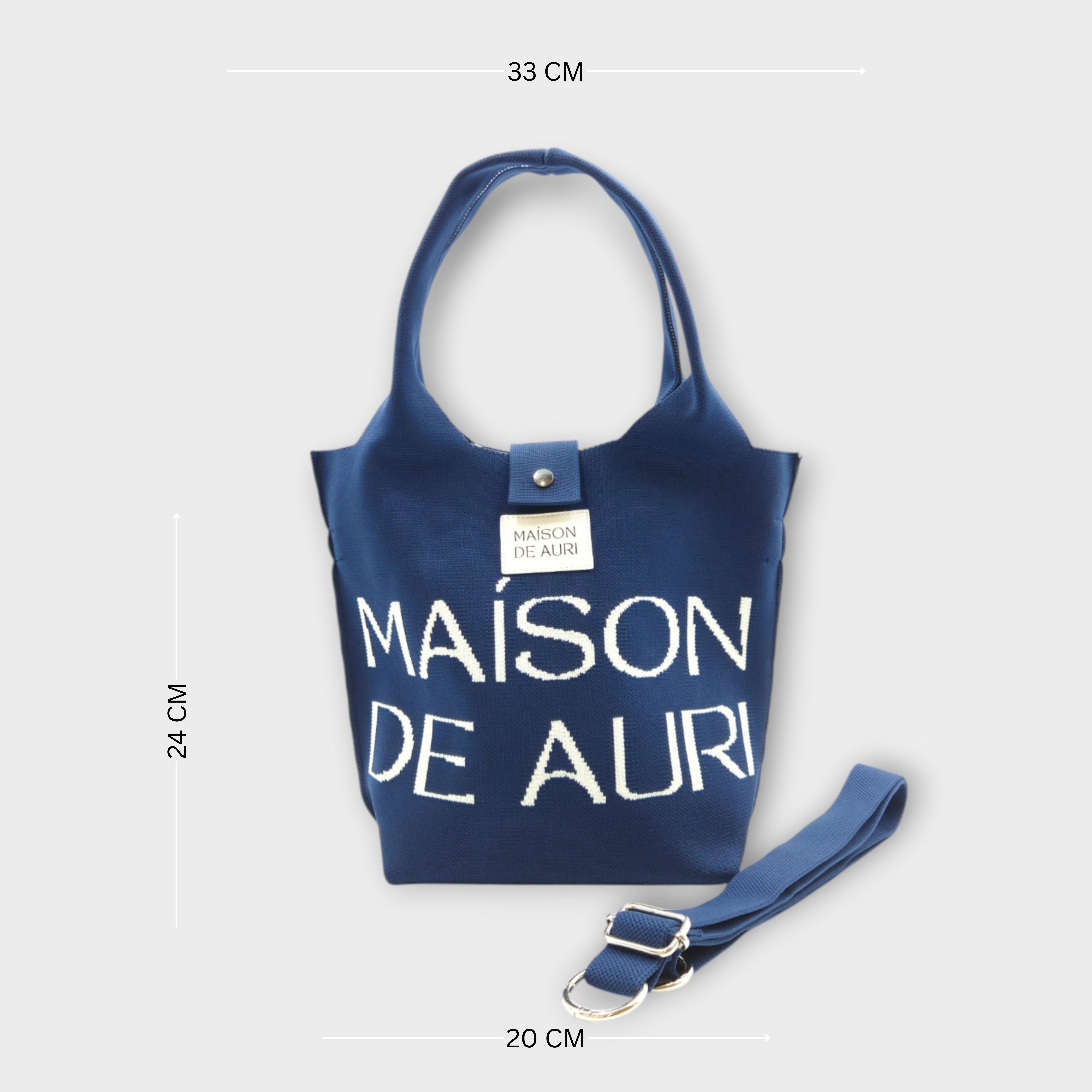 深藍丹寧的飽和藍色為底,正面織入 MAISON DE AURI 大型品牌字樣,展現極簡卻搶眼的風格。