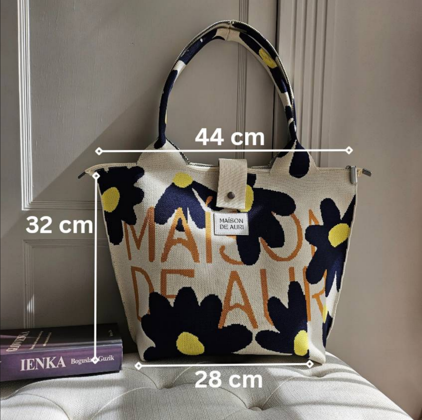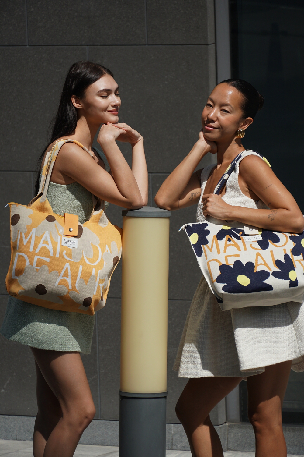 MAISON DE AURI 的品牌字樣以低調的方式隱藏在深藍與黃色花卉之間,