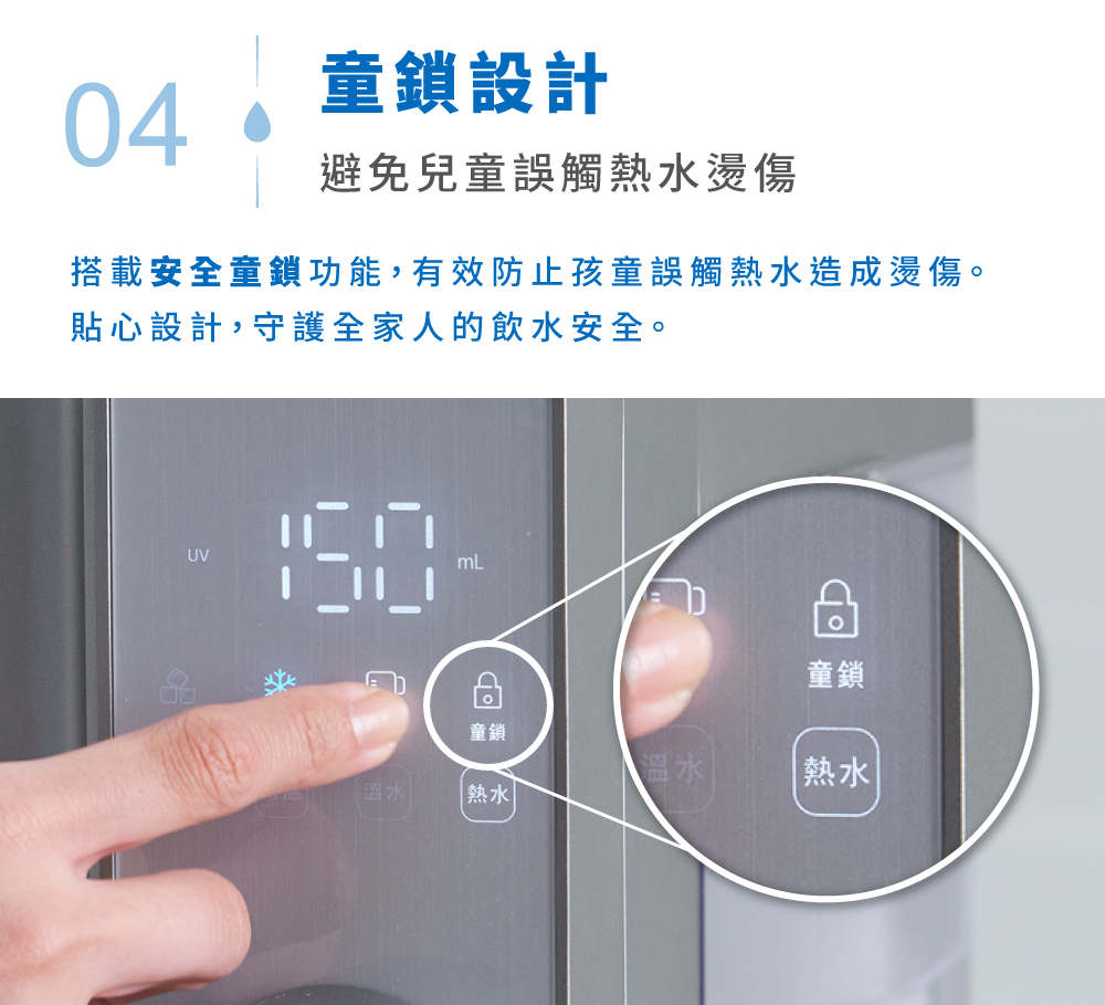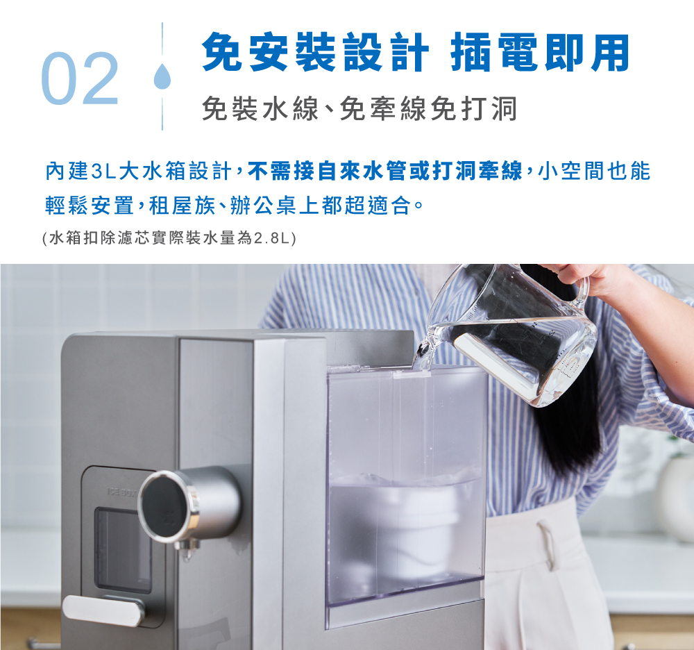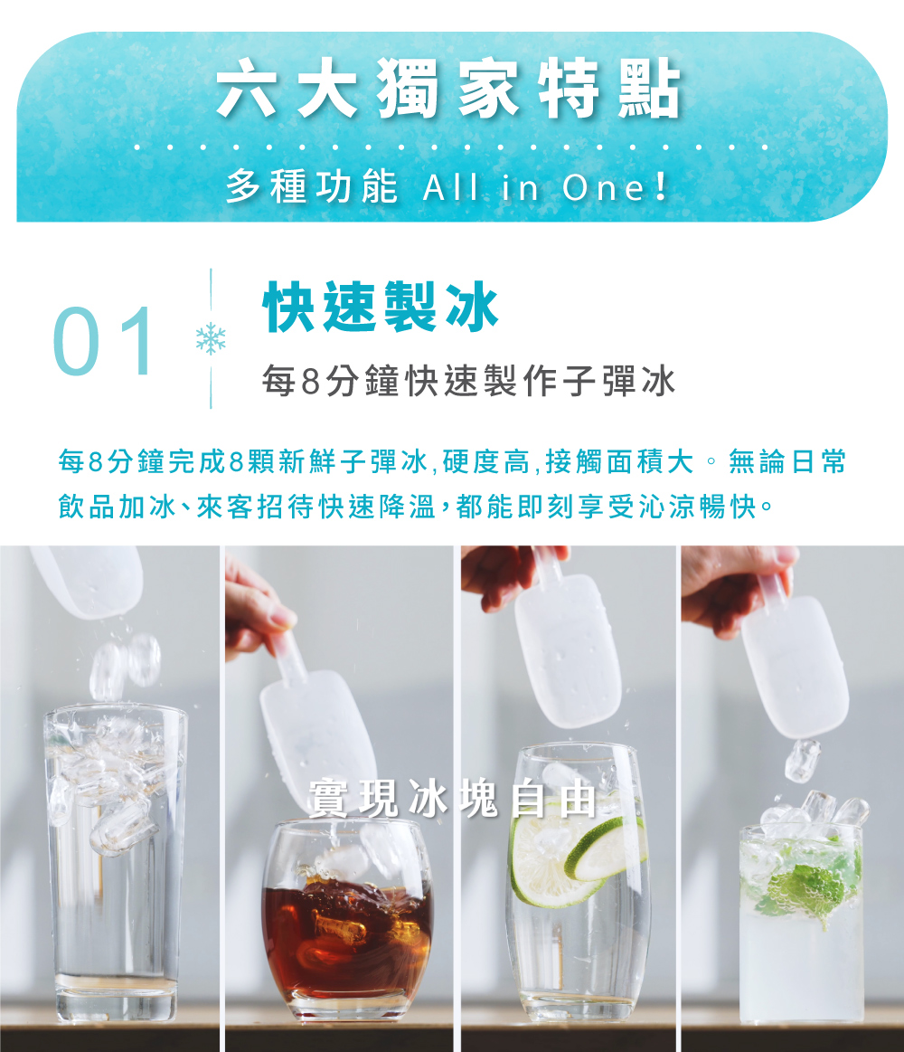 1.快速製冰:每8分鐘快速製作子彈冰(每次8顆) 2.5度C冰水:冰箱同類型壓縮機,隨時提供5度真冰水 3.3秒瞬熱:專業不鏽鋼厚膜加熱,即熱即飲 4.OASIS五重過濾濾心:通過SGS生飲水標準與WQA美國水質協會金牌 5.UV抗菌:內建UV殺菌裝置,搭配濾心,每一口水都喝得安心 6.7段溫控設計:5-95度C(5/常溫/45/55/70/85/95度C) 7.4段水量:150cc/300cc/500cc/連續出水 8.免安裝設計:內建2.8L水箱,插電即用