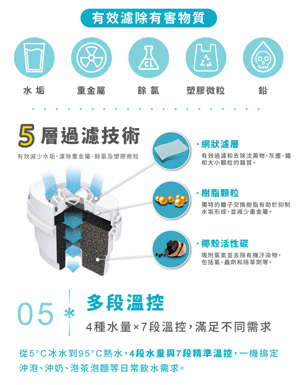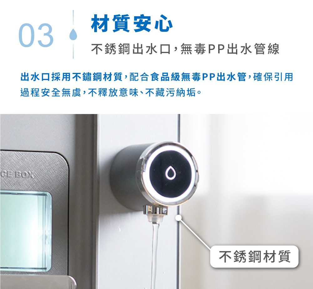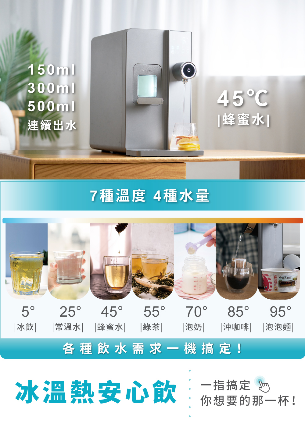 1.快速製冰:每8分鐘快速製作子彈冰(每次8顆) 2.5度C冰水:冰箱同類型壓縮機,隨時提供5度真冰水 3.3秒瞬熱:專業不鏽鋼厚膜加熱,即熱即飲 4.OASIS五重過濾濾心:通過SGS生飲水標準與WQA美國水質協會金牌 5.UV抗菌:內建UV殺菌裝置,搭配濾心,每一口水都喝得安心 6.7段溫控設計:5-95度C(5/常溫/45/55/70/85/95度C) 7.4段水量:150cc/300cc/500cc/連續出水 8.免安裝設計:內建2.8L水箱,插電即用
