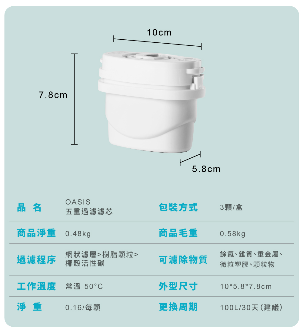 OASIS Curve5重淨化過濾系統:PP棉→離子轉換樹脂→椰殼活性碳→微粒濾網→PP棉